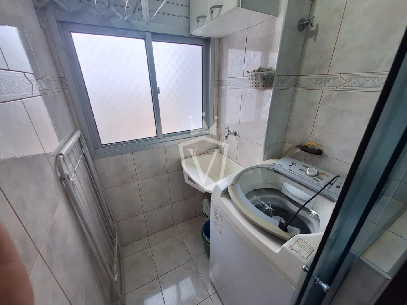 - Lavanderia com armários e máquina de lavar