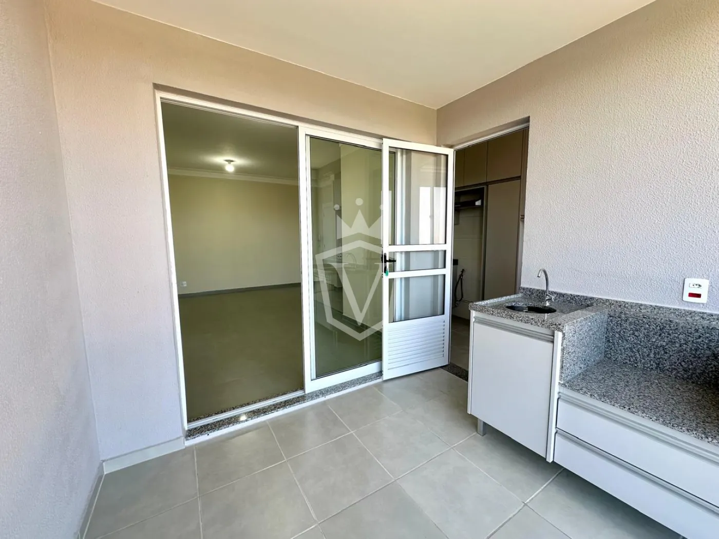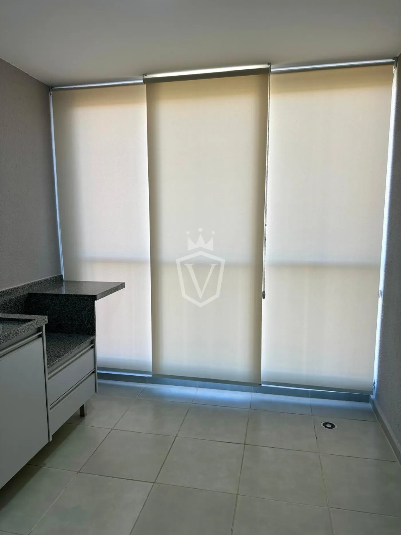 - Varanda gourmet com gabinete, envidraçada e com persianas