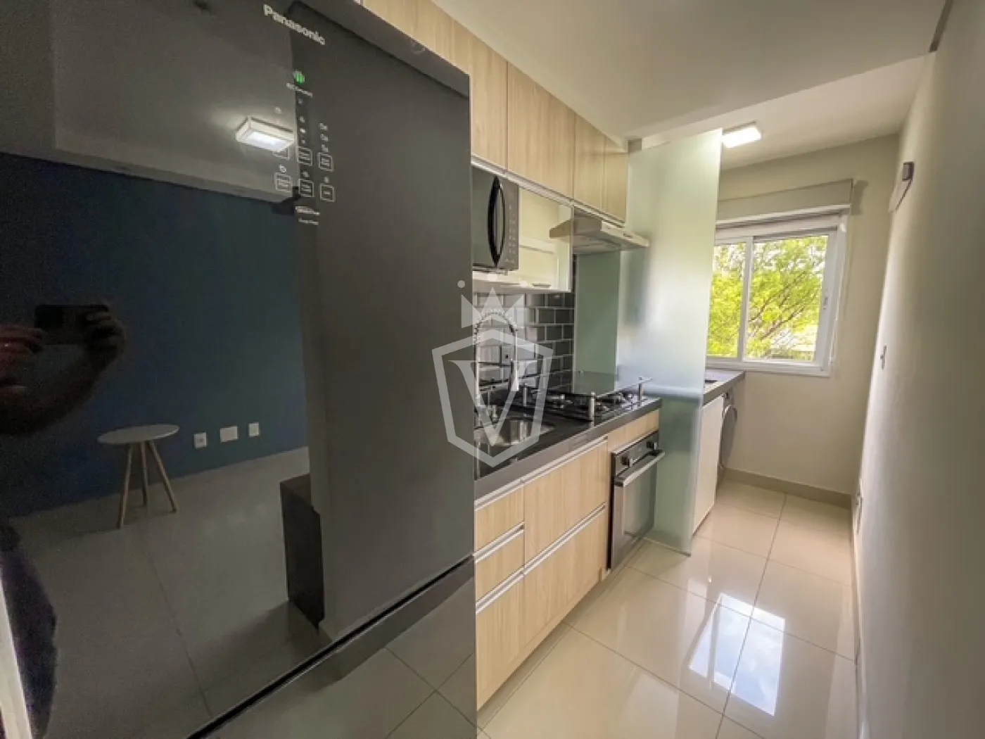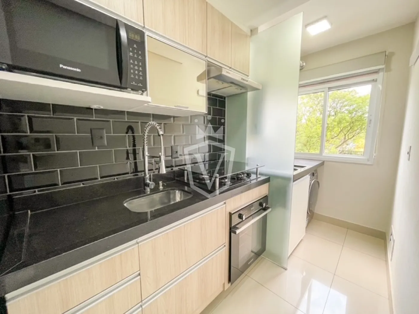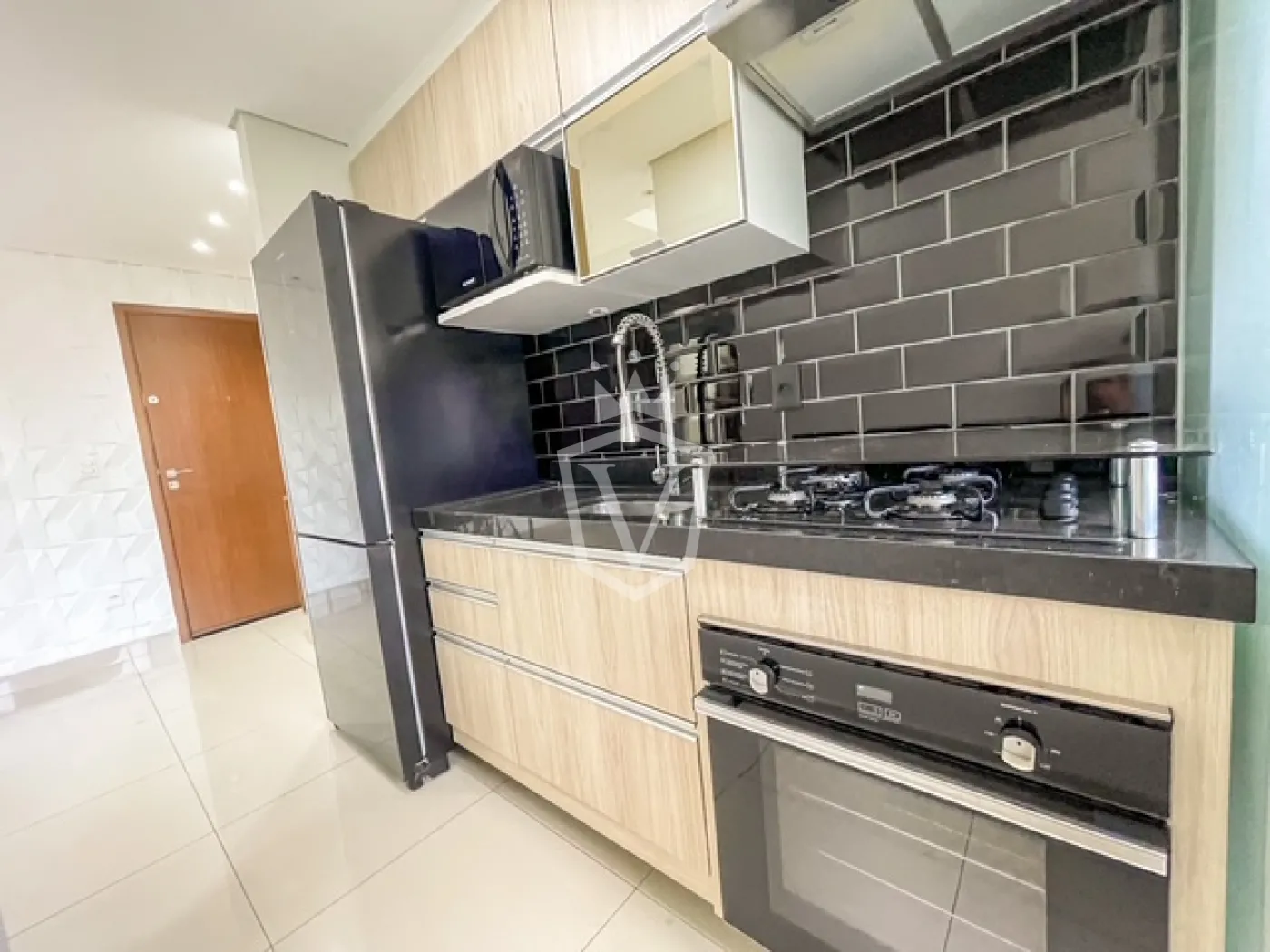 - Cozinha completa com armários planejados, geladeira, forno, cooktop, coifa e microondas.
