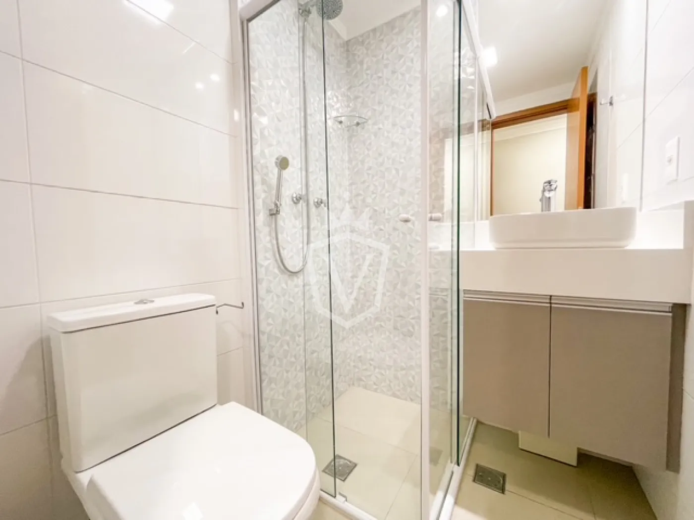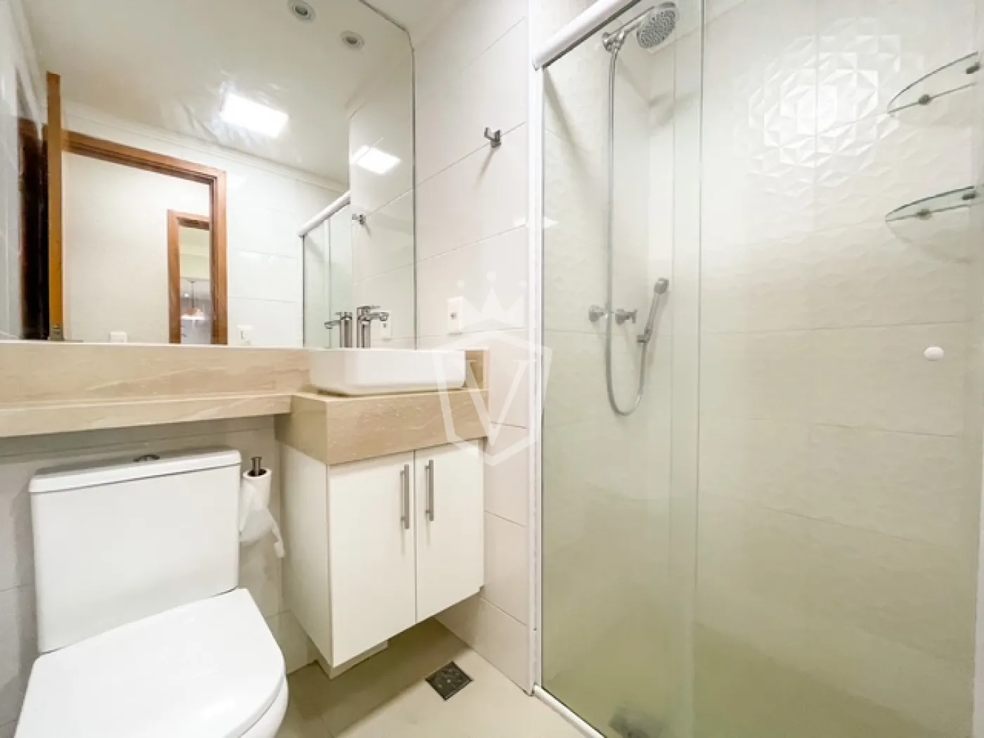 - Banheiros com box de vidro e gabinete