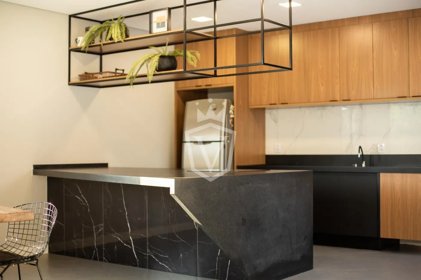 - Ilha central e cozinha com móveis planejados