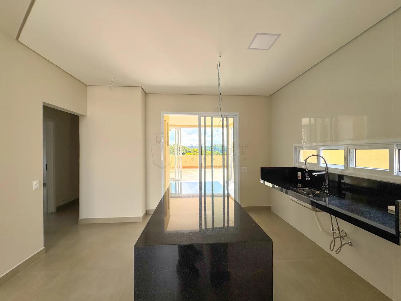 Ilha de mármore na cozinha preparada para receber fogão de indução.