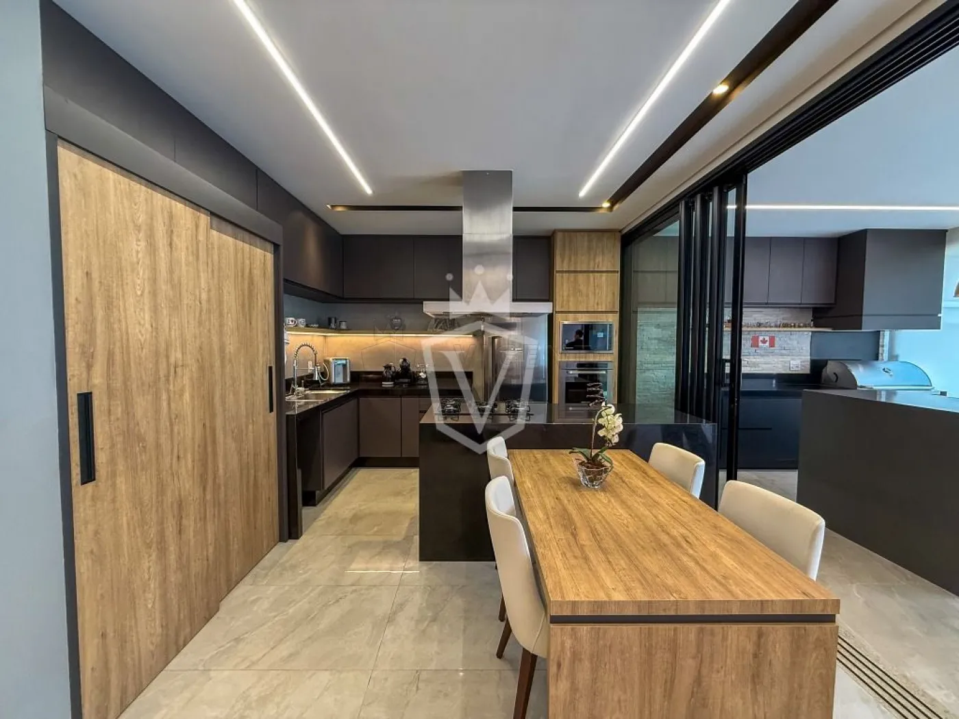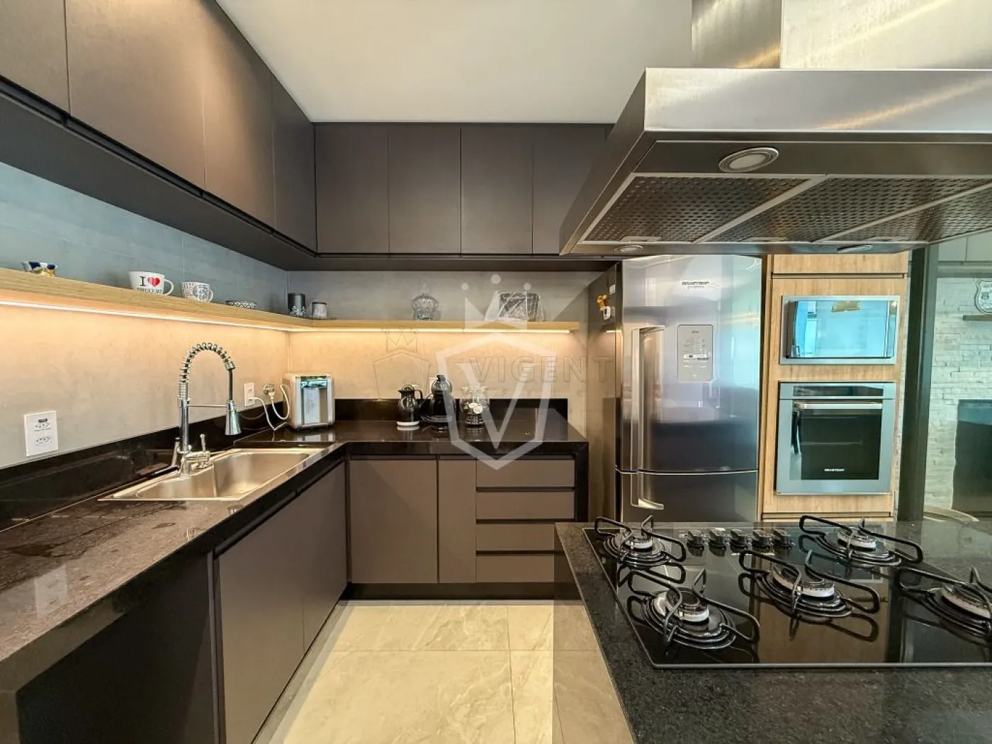 - Cozinha em conceito aberto planejada com cooktop, coifa e forno